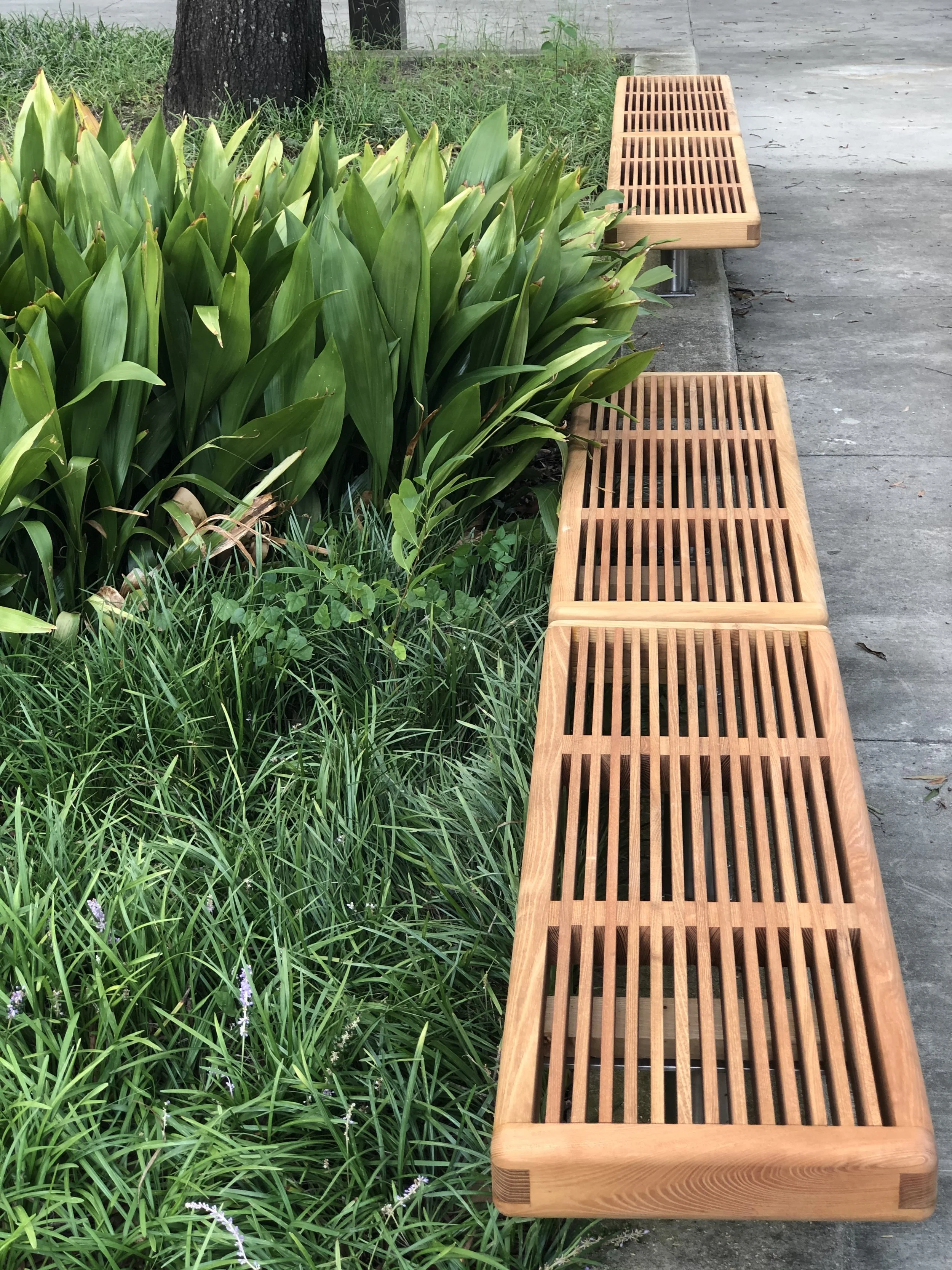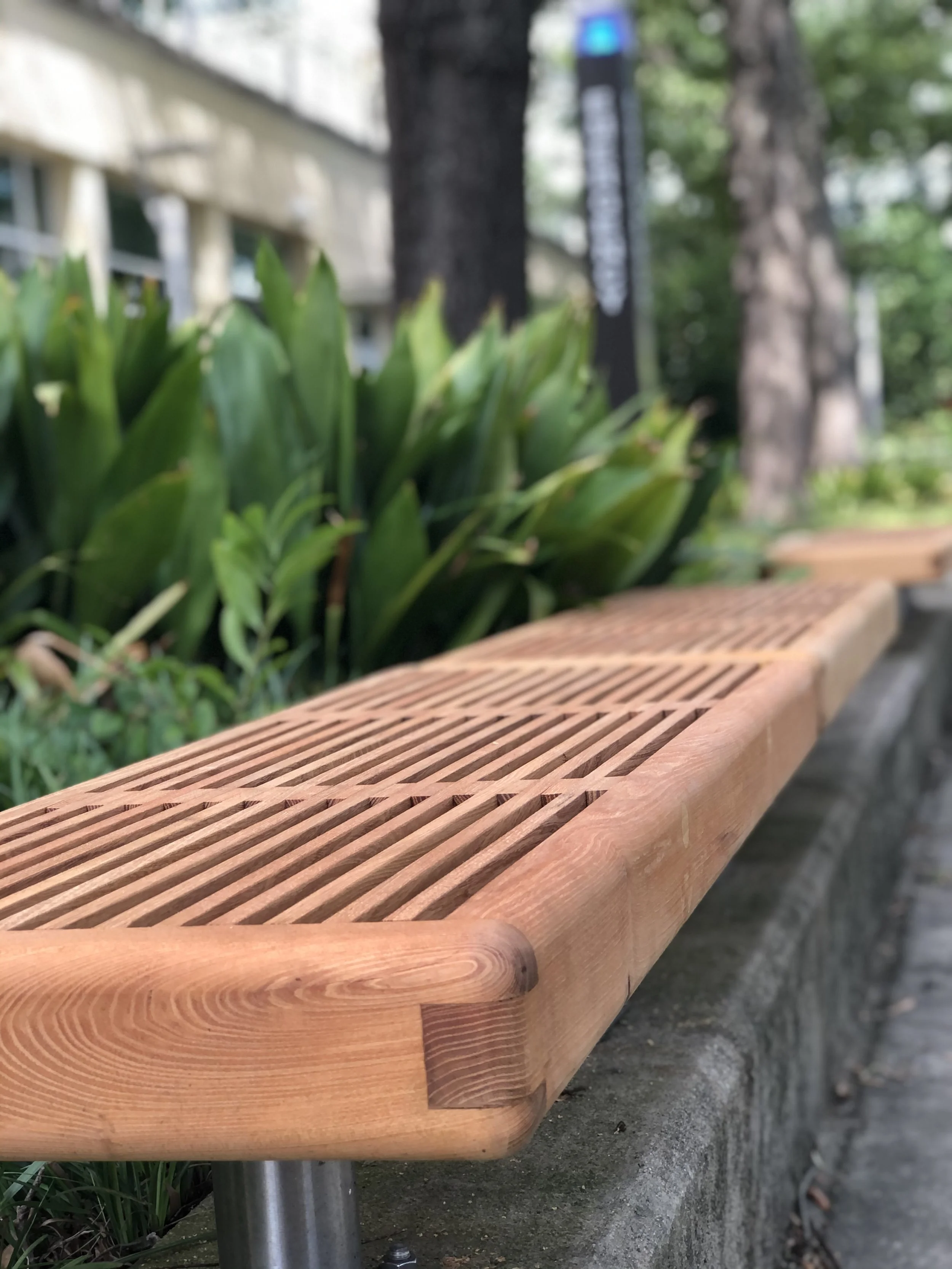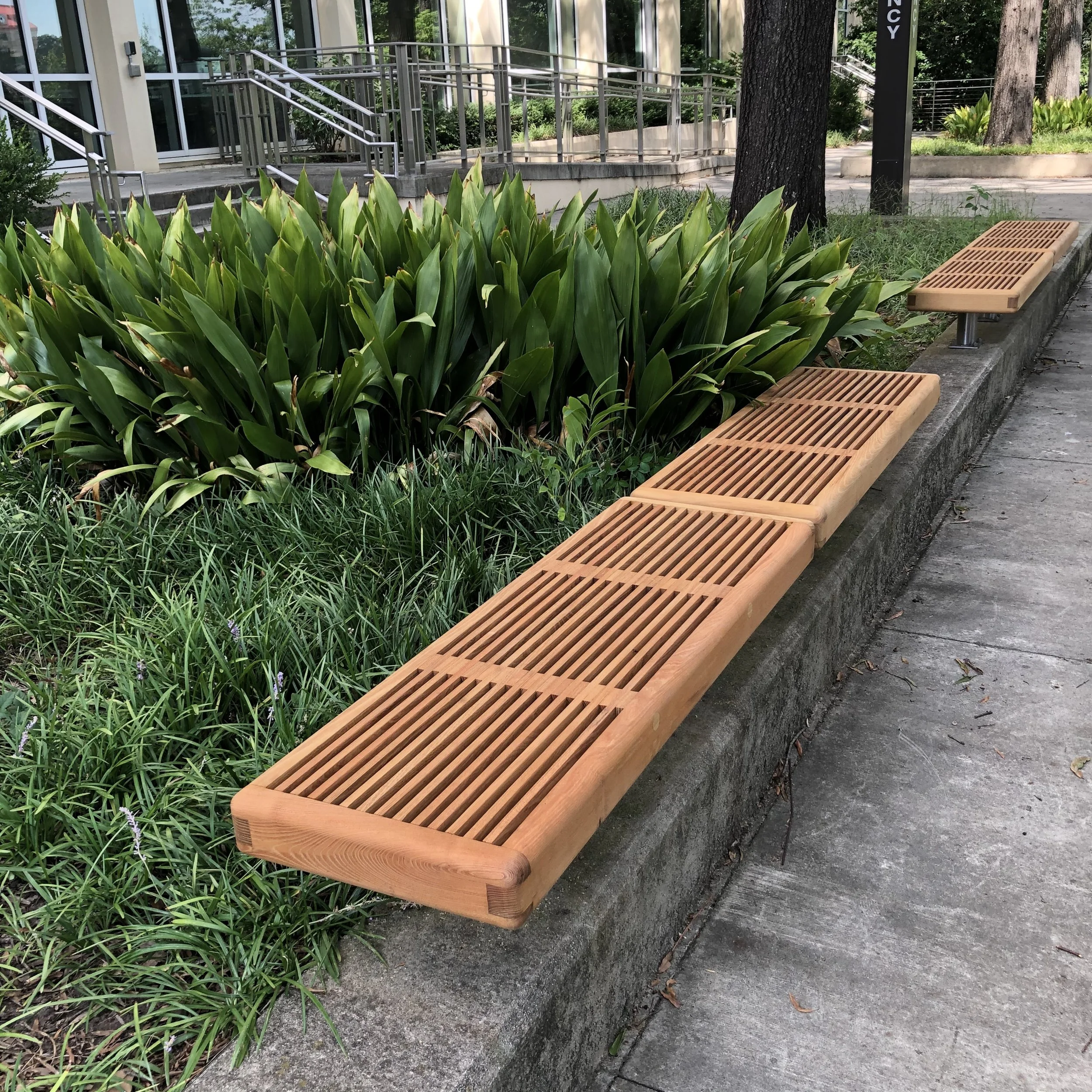Black Locust Benches built for the University of South Carolina- Columbia. Twenty-five benches replaced existing benches in the historic Patterson Hall (built 1962) outdoor seating area.